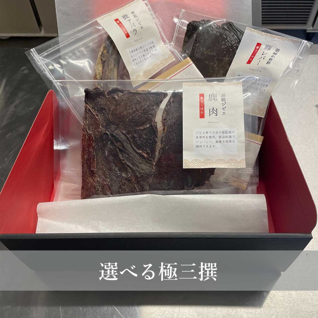 定番のマグロ・鹿・豚レバーのほか、噛み応え抜群の鹿あばら骨・鶏手羽先の先ジャーキーもご用意しています。それぞれ違った風味と食感を楽しめるため、偏食気味なワンちゃんにも好評です。